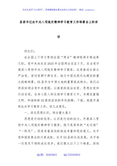 / 县委书记在中央八项规定精神学习教育工作部署会上的讲话