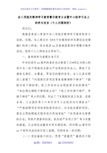 / 在八项规定精神学习教育警示教育大会暨中心组学习会上的研讨发言(个人问题剖析)