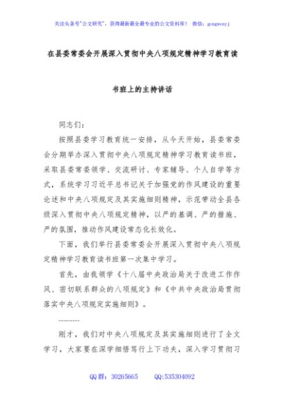/ 在县委常委会开展深入贯彻中央八项规定精神学习教育读书班上的主持讲话