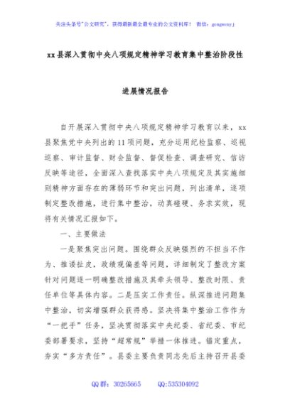 / xx县深入贯彻中央八项规定精神学习教育集中整治阶段性进展情况报告