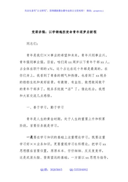 / 党课讲稿:以学铸魂担使命青年逐梦启新程(税务)