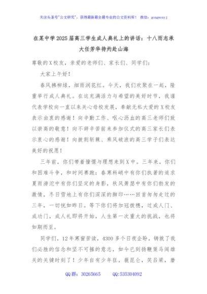 / 在某中学2025届高三学生成人典礼上的讲话:十八而志承大任芳华待灼赴山海