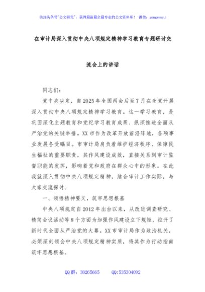 / 在审计局深入贯彻中央八项规定精神学习教育专题研讨交流会上的讲话