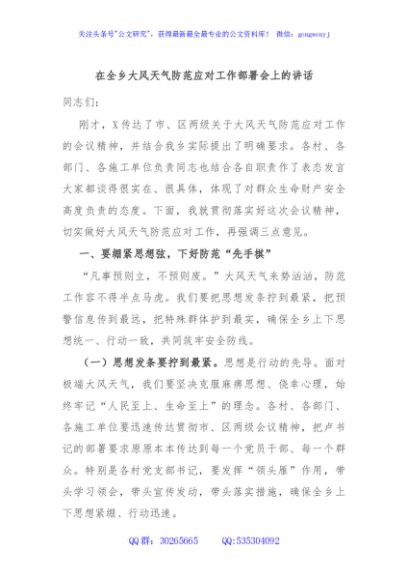 / 在全乡大风天气防范应对工作部署会上的讲话