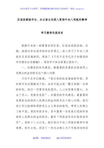 / 区政协副秘书长、办公室主任深入贯彻中央八项规定精神学习教育交流发言