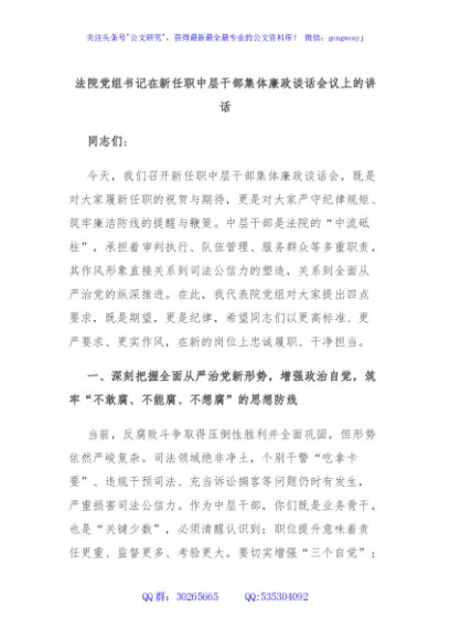 / 法院党组书记在新任职中层干部集体廉政谈话会议上的讲话