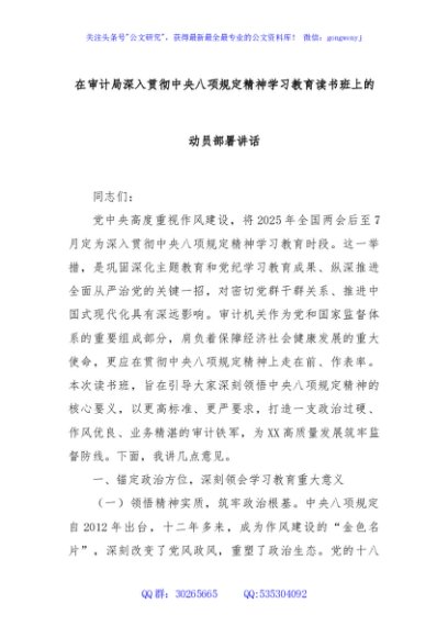 / 在审计局深入贯彻中央八项规定精神学习教育读书班上的动员部署讲话