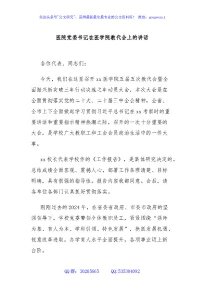 / 医院党委书记在医学院教代会上的讲话