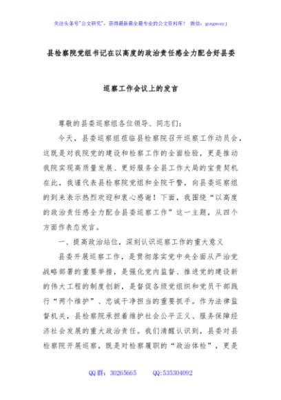 / 县检察院党组书记在以高度的政治责任感全力配合好县委巡察工作会议上的发言
