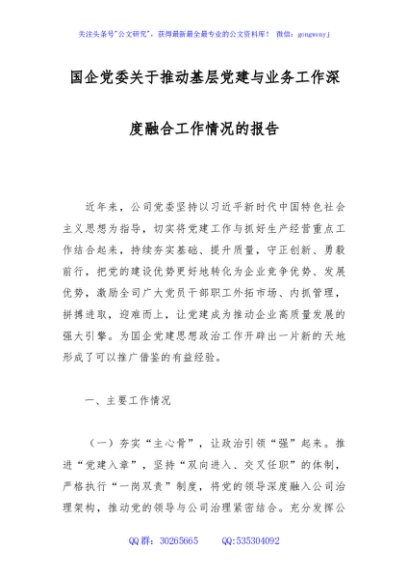 / 国企党委关于推动基层党建与业务工作深度融合工作情况的报告