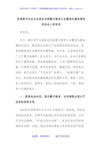 / 县委副书记在全县政法系统警示教育大会暨党风廉政建设约谈会上的讲话