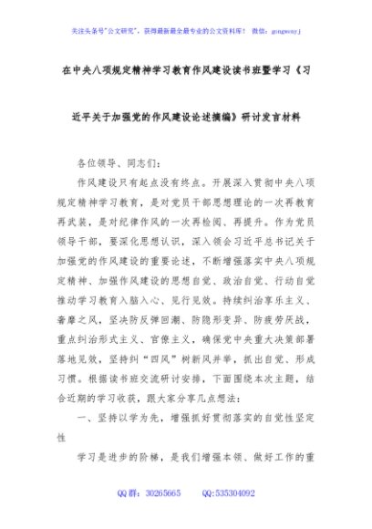 / 在中央八项规定精神学习教育作风建设读书班暨学习《习近平关于加强党的作风建设论述摘编》研讨发言材料