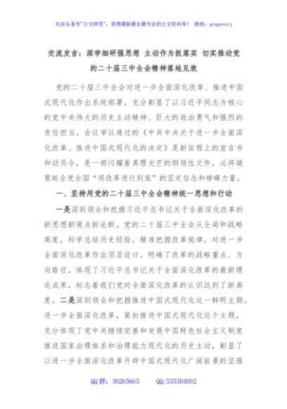 / 交流发言:深学细研强思想 主动作为抓落实 切实推动党的二十届三中全会精神落地见效