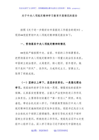/ 关于中央八项规定精神学习教育开展情况的报告