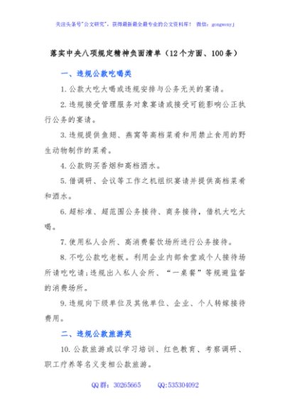 / 落实中央八项规定精神负面清单(12个方面、100条)