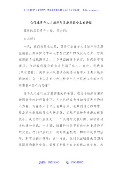 / 在行业青年人才培养与发展座谈会上的讲话