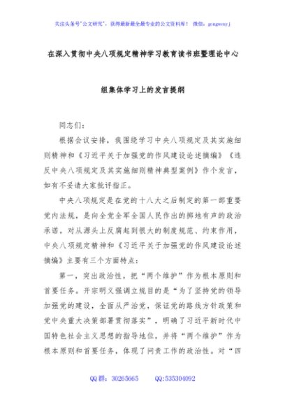 / 在深入贯彻中央八项规定精神学习教育读书班暨理论中心组集体学习上的发言提纲