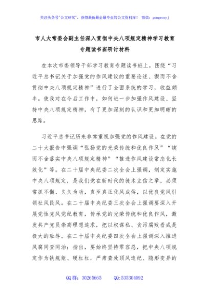 / 市人大常委会副主任深入贯彻中央八项规定精神学习教育专题读书班研讨材料