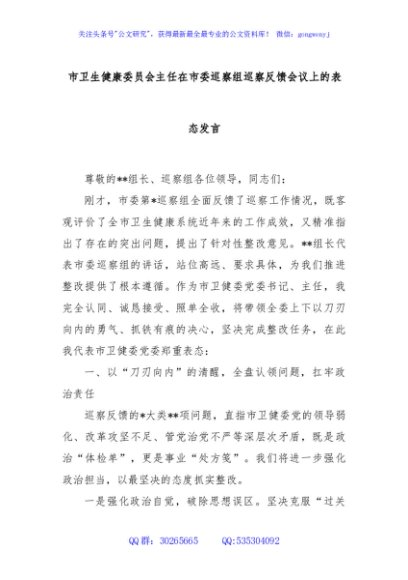 / 市卫生健康委员会主任在市委巡察组巡察反馈会议上的表态发言