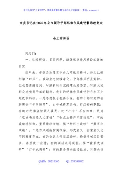 / 市委书记在2025年全市领导干部纪律作风建设警示教育大会上的讲话