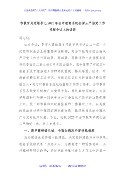 / 市教育局党组书记2025年全市教育系统全面从严治党工作视频会议上的讲话