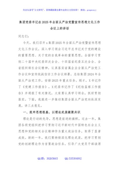 / 集团党委书记在2025年全面从严治党暨宣传思想文化工作会议上的讲话