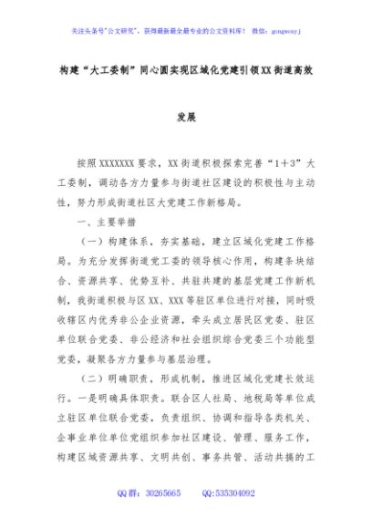 / 构建“大工委制”同心圆实现区域化党建引领XX街道高效发展