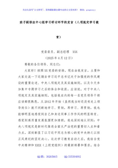 / 班子副职在中心组学习研讨环节的发言(八项规定学习教育)