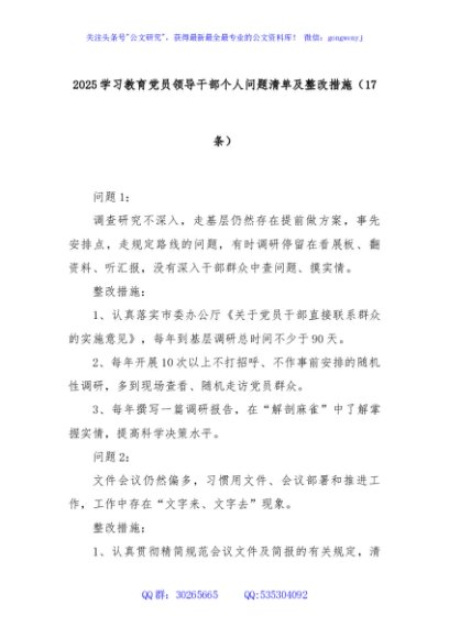 / 2025学习教育党员领导干部个人问题清单及整改措施(17条)