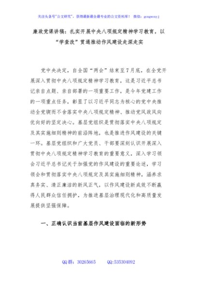 / 廉政党课讲稿:扎实开展中央八项规定精神学习教育,以“学查改”贯通推动作风建设走深走实