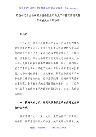 / 纪委书记在全县教育系统全面从严治党工作暨以案促改警示教育大会上的讲话
