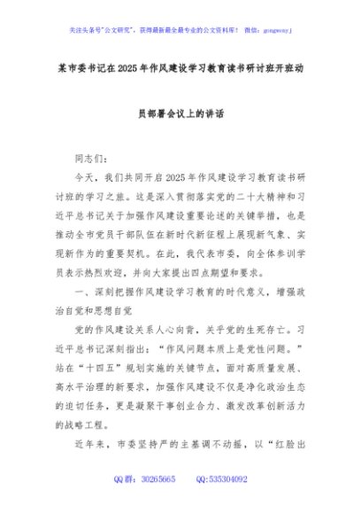 / 某市委书记在2025年作风建设学习教育读书研讨班开班动员部署会议上的讲话