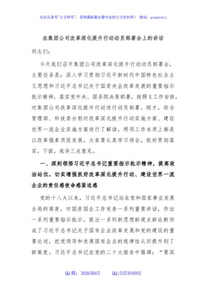 / 在集团公司改革深化提升行动动员部署会上的讲话
