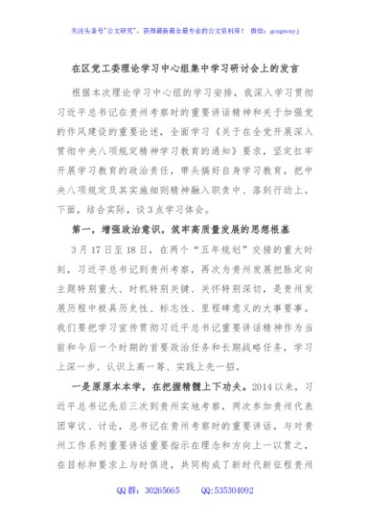 / 在区党工委理论学习中心组集中学习研讨会上的发言