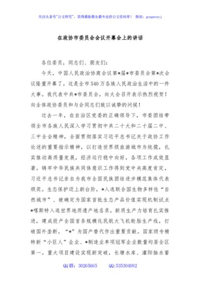 / 在政协市委员会会议开幕会上的讲话