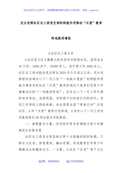 充分发挥社区关工委党支部的职能作用推动“五爱”教育阵地提质增效