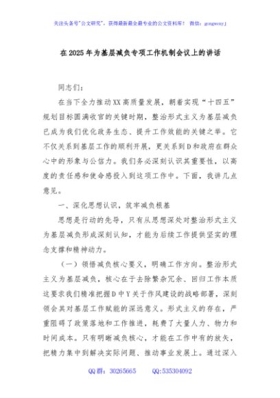 / 在2025年为基层减负专项工作机制会议上的讲话