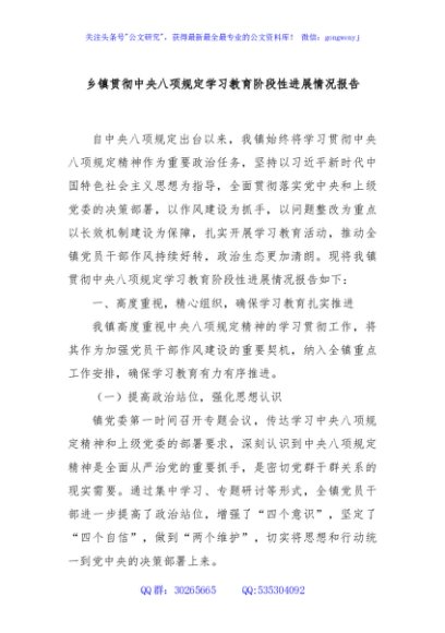 乡镇贯彻中央八项规定学习教育阶段性进展情况报告
