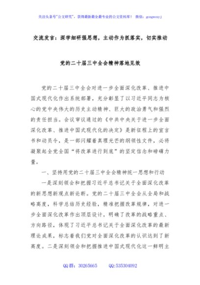 / 交流发言:深学细研强思想,主动作为抓落实,切实推动党的二十届三中全会精神落地见效