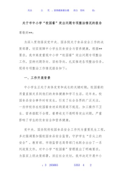 / 关于市中小学“校园餐”突出问题专项整治情况的报告