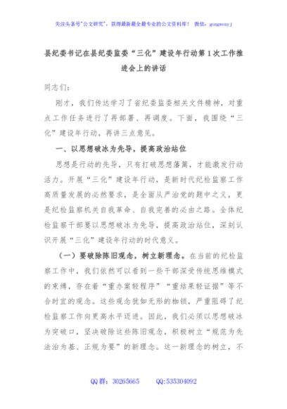 / 县纪委书记在县纪委监委“三化”建设年行动第1次工作推进会上的讲话
