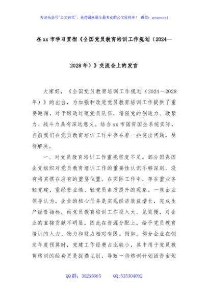/ 在xx市学习贯彻《全国党员教育培训工作规划(2024—2028年)》交流会上的发言