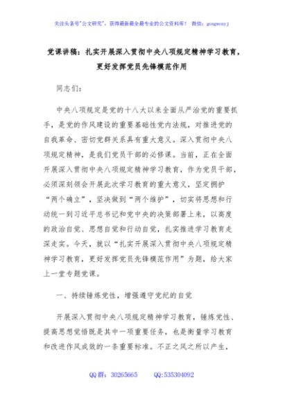 / 党课讲稿:扎实开展深入贯彻中央八项规定精神学习教育,更好发挥党员先锋模范作用