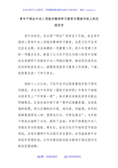 / 青年干部在中央八项规定精神学习教育专题读书班上的交流发言