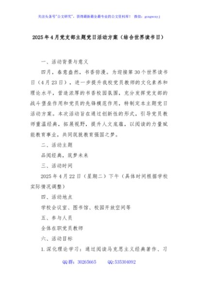 / 2025年4月党支部主题党日活动方案(结合世界读书日)
