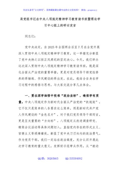 / 局党组书记在中央八项规定精神学习教育读书班暨理论学习中心组上的研讨发言