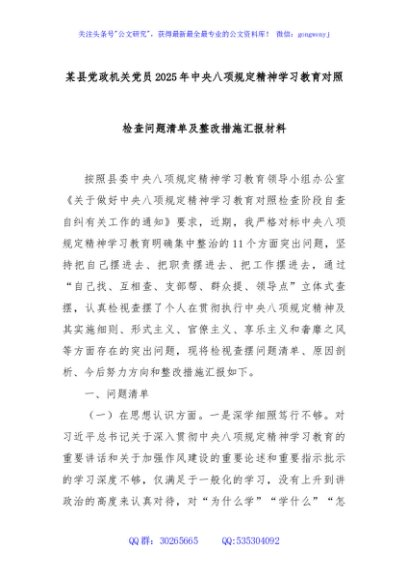 / 某县党政机关党员2025年中央八项规定精神学习教育对照检查问题清单及整改措施汇报材料