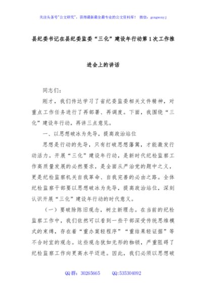 / 县纪委书记在县纪委监委“三化”建设年行动第1次工作推进会上的讲话