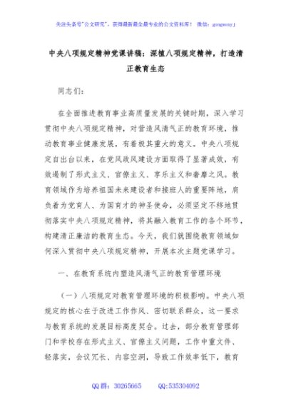 / 中央八项规定精神党课讲稿:深植八项规定精神,打造清正教育生态