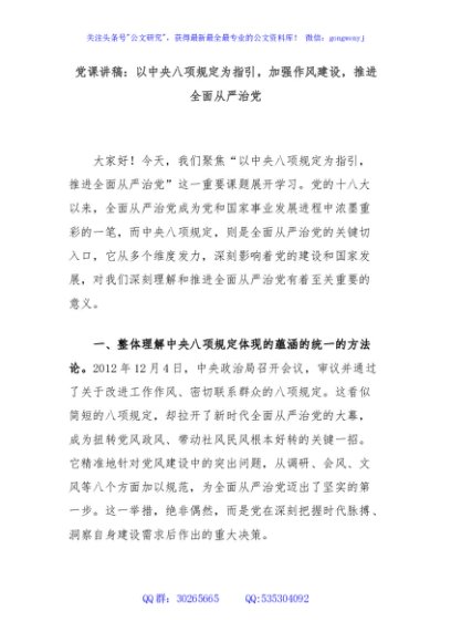 / 党课讲稿:以中央八项规定为指引,加强作风建设,推进全面从严治党